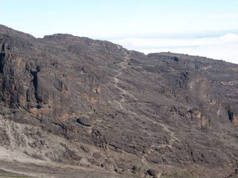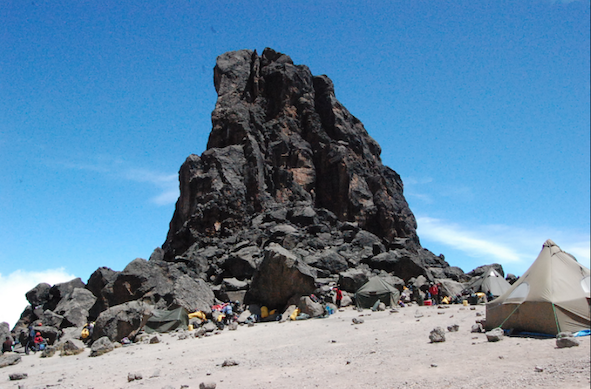 Au cours de ce deuxième jour en montagne, le sentier Lemosho rejoint le sentier Machame. La randonnée mène du camp de Shira 2 à la magnifique tour de lave à 4 630 m (15 190 pi). Cette partie de l’ascension comporte de nombreuses montées et descentes, mais offre de magnifiques vues en cours de route. C’est une longue randonnée et vous pourriez commencer à vous sentir un peu mal à l’aise à cause de l’altitude. Il est donc important de trouver le bon rythme pour que votre corps s’y adapte. Après le déjeuner, vous descendez vers le camp de Barranco au pied du mur de Barranco.