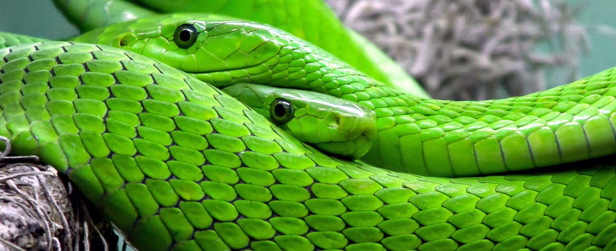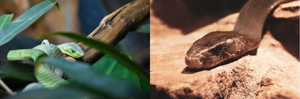 Les mambas appartiennent au genre des serpents venimeux, le mamba noir et le mamba vert étant probablement les serpents les plus célèbres au monde. Moins connus, mais à peine moins dangereux, sont le mamba de Jameson et le mamba commun (qui est d’ailleurs encore plus vert que le mamba vert). Ils vivent tous exclusivement en Afrique, aiment passer leur temps dans des terriers, des monticules de pierre et dans les arbres et se nourrissent d’oiseaux, de lézards et de petits mammifères. Lorsqu’un mamba se sent menacé, il mord généralement à plusieurs reprises. Le mamba noir se distingue particulièrement : il peut atteindre une vitesse de 20 km/h et est le plus grand serpent venimeux de tout le continent, mesurant jusqu’à quatre mètres de long.