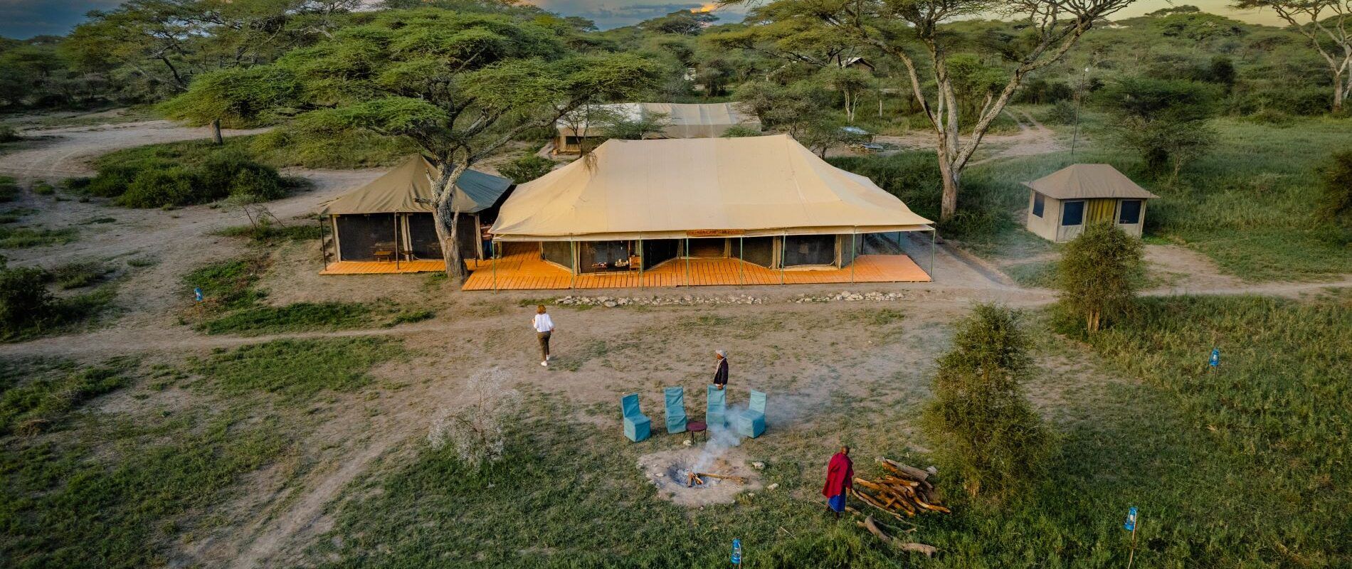 Le camp dispose de 12 grandes tentes (dont une familiale composée de deux tentes), d’un espace lounge et d’une tente de restauration. Les tentes (doubles ou triples sur demande) sont dotées d’une salle de bains privative et d’un lit king-size ou de deux lits simples. Le petit-déjeuner, le déjeuner et le dîner sont servis dans la tente de restauration et sont fraîchement préparés quotidiennement par les chefs cuisiniers. Enfin, une télévision de brousse (un feu de camp !) sera allumée vous divertir le soir, au son des hennissements des zèbres et des rugissements des lions.