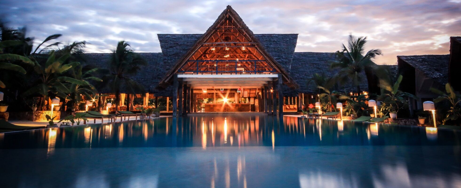 Fun Beach Resort, sur la côte sud-est de Zanzibar, combine vie en bord de mer avec nage, bonne nourriture et détente. Le complexe dispose de chambres, de bungalows et de suites, tous équipés de la climatisation, du Wi-Fi, de salles de bain privative avec eau chaude dans les douches, de moustiquaires et de coffres-forts. Vous avez le choix: baignades dans l’océan ou dans l’une des deux piscines, en alternance avec des soins spa, du repos dans le salon sous un toit en makuti (feuilles de cocotier séchées) ou encore, des dégustations de fruits de mer locaux et d’une cuisine internationale avec des options végétariennes et végétaliennes. Au bar, vous trouvez des boissons toute la journée, tandis que sur la plage bordée de cocotiers, la place est à la détente et au divertissement.