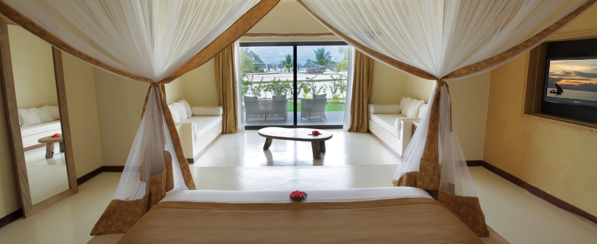 Sur la côte nord-ouest de Zanzibar, directement sur la grande plage blanche sans marées de Kendwa, Gold Zanzibar beach cottage dispose de 67 chambres conçues dans un mélange de styles africains et arabes, avec une touche moderne ! La propriété détient une grande piscine avec des chaises longues ainsi qu’un accès direct à la plage pour que vous puissiez choisir entre bain d’eau douce ou bain d’eau salée. Les options pour dîner sont variées, avec quatre restaurants servant une multitude de choses allant de fruits de mer à des plats internationaux. Pour encore plus de bien-être, un spa est disponible, utilisant des produits naturels, et en soirée, vous pouvez savourer des cocktails face au coucher de soleil… encore meilleurs au restaurant de la plage, les pieds dans le sable.