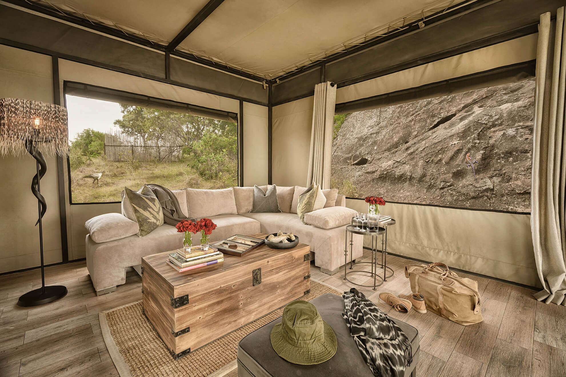 Dans cet établissement, tout est pensé pour que vous puissiez vous émerveiller devant les troupeaux de gnous et de zèbres qui défilent fréquemment. Vous y trouverez une piscine à débordement dans la roche, où vous pouvez siroter un verre tout en observant la faune sauvage qui passe. Vous pouvez contempler le paysage depuis le confort de votre lit, le lit à balançoire de votre terrasse ou encore depuis la romantique baignoire en cuivre perchée devant les baies vitrées qui s’ouvrent sur les vastes plaines. En outre, les deux tentes réservées aux familles et aux jeunes mariés disposent de leur propre piscine à débordement, qui offre également une vue à couper le souffle. Les plats proposés mettent l’eau à la bouche et le service est impeccable. Voilà un endroit privilégié pour passer un moment inoubliable à la découverte de la Grande Migration !